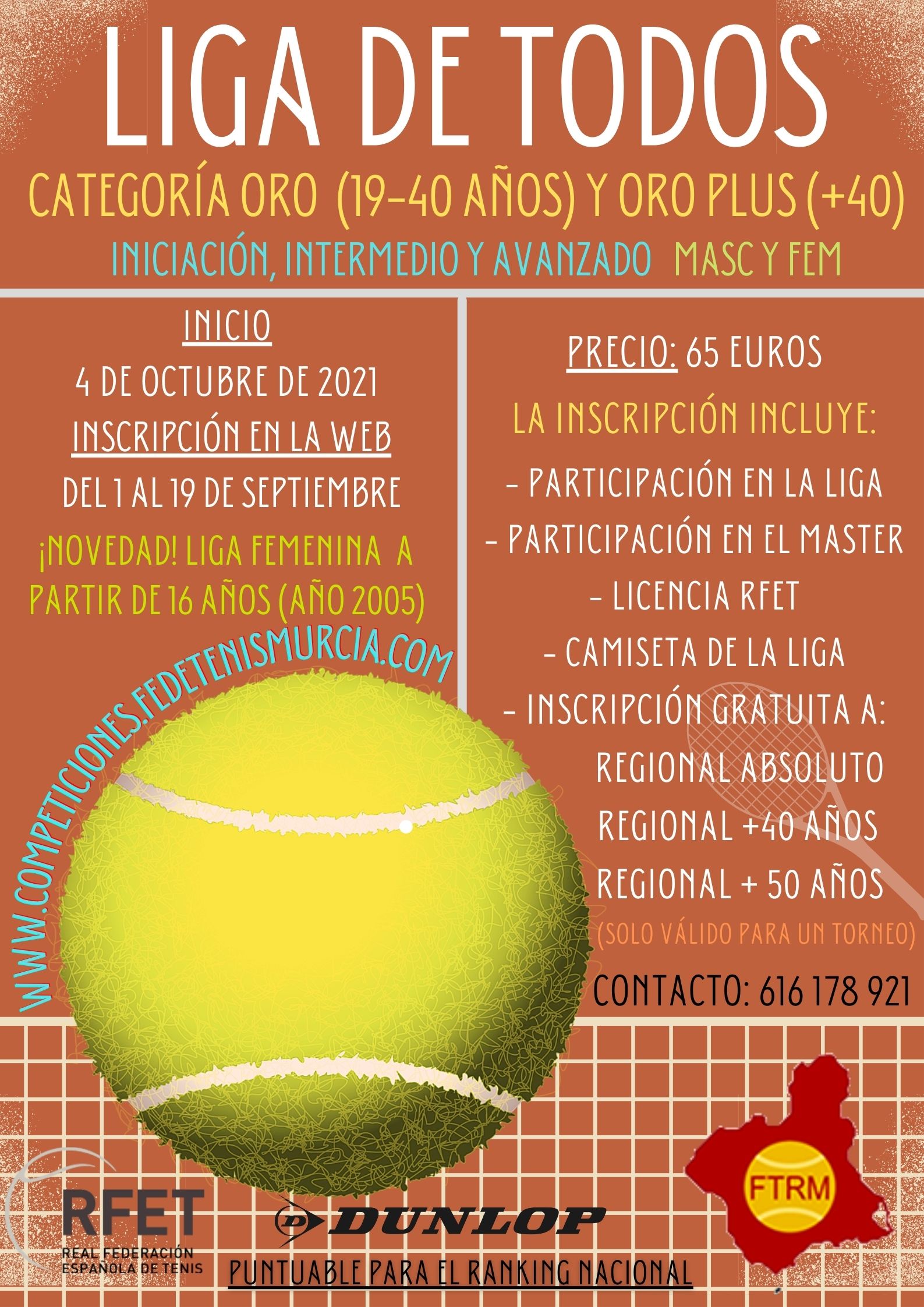 La Federación de Tenis de la Región de Murcia, pone en marcha la II edición de la Liga de Todos. Tras la buena acogida que tuvo la primera edición, vuelve la Liga de Todos. El plazo de inscripción ya se encuentra abierto hasta el 19 de Septiembre. La inscripción se realizará en el siguiente enlace. La Liga de Todos, va dirigida a todos los niveles de juego, desde iniciación a avanzado tanto en categoría masculina como femenina.