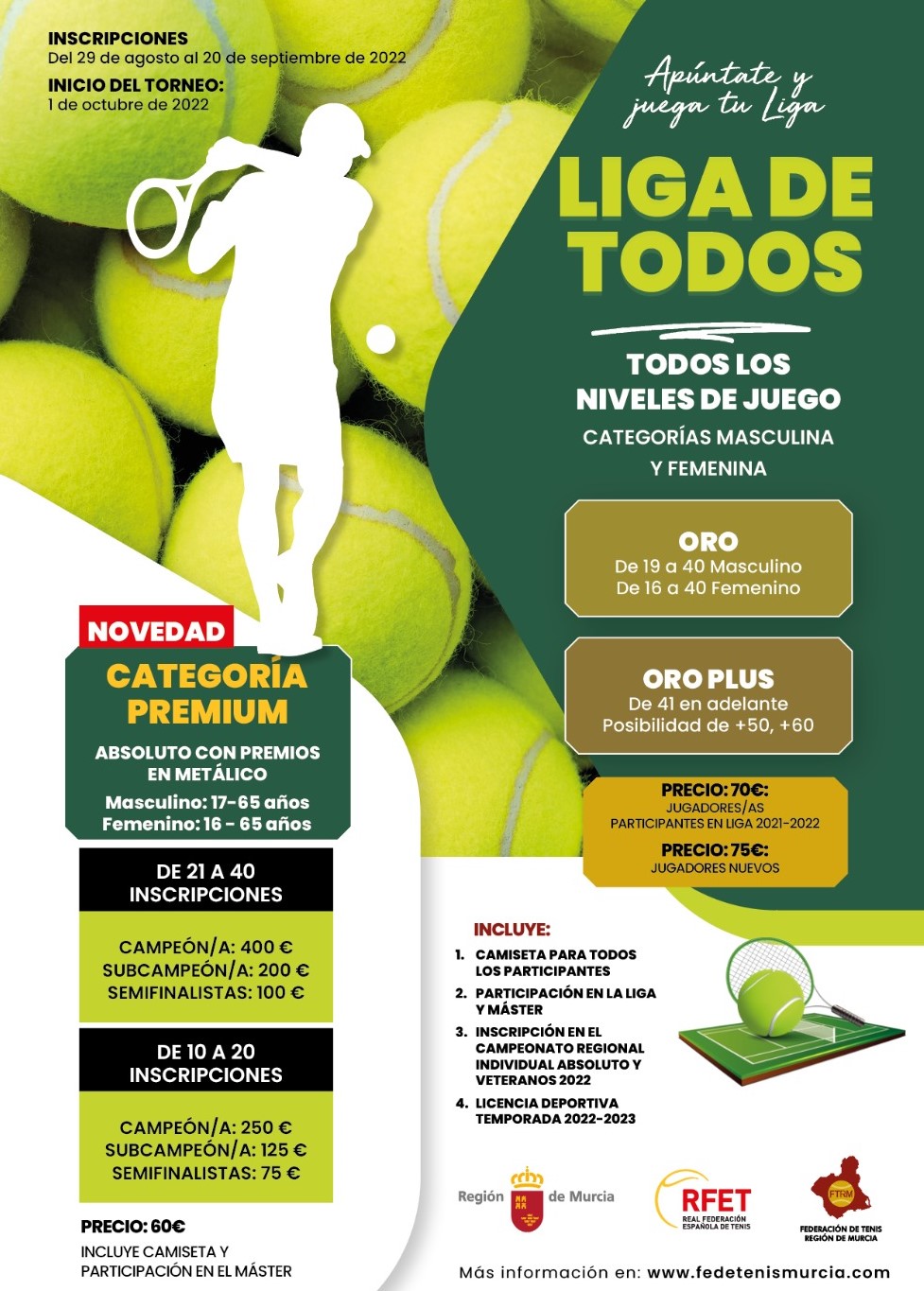 La Federación de Tenis de la Región de Murcia, ha abierto el plazo de inscripción de la III edición de la Liga de Todos. El plazo de inscripción estará abierto hasta el 20 de septiembre y se podrá realizar a través del siguiente enlace: La liga de todos.