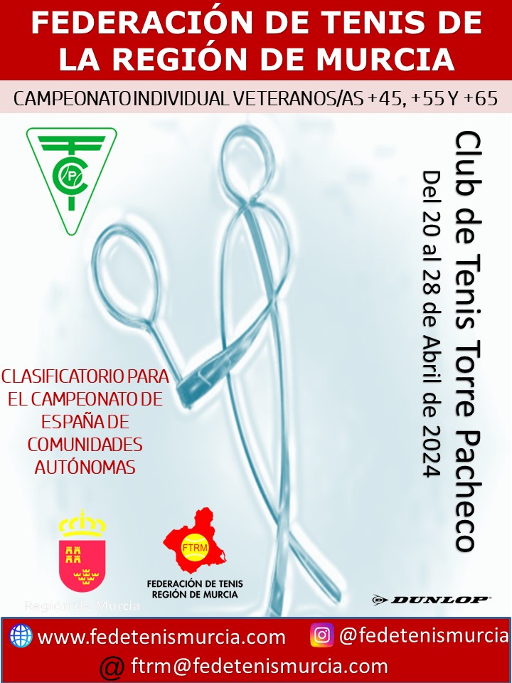 A partir del 20 de abril, se disputaré en el Club de Tenis Torre Pacheco el Campeonato Individual de veteranos y veteranas clasificatorio para el Campeonato de España de Comunidades Autónomas en las categorías de +45, +55 y +65