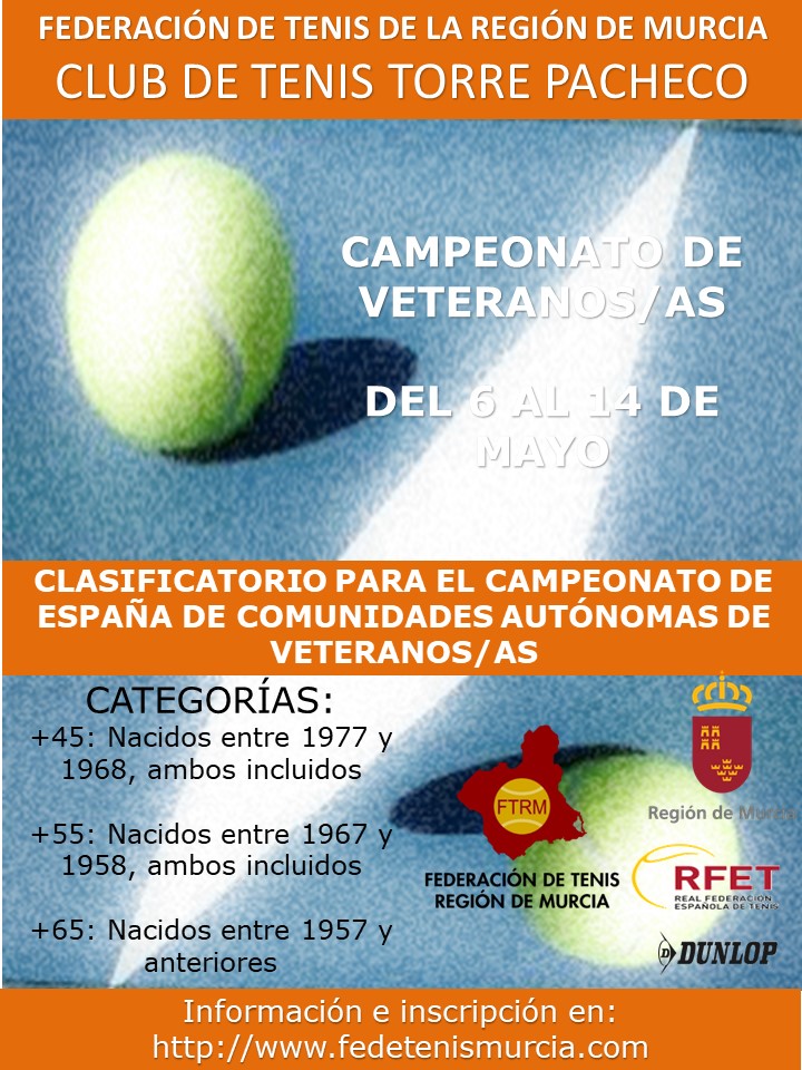La Federación de Tenis de la Región de Murcia va a celebrar el Campeonato Individual de veteranos/as de la Región de Murcia en las categorías +45,+55 y +65 y que será clasificatorio para el Campeonato de España de Comunidades Autónomas.