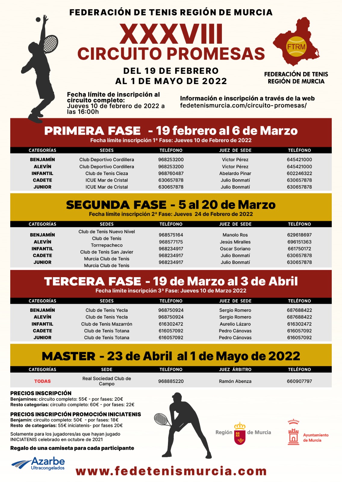 A partir del 19 de Febrero de 2022, comienza la edición número 38 del Circuito Promesas de la Federación de Tenis de la Región de Murcia. El Circuito consta de 3 fases y un master. Cada jugador/a participante tendrá una camiseta de regalo. Habrá premios y material deportivo para los jugadores/as mejores clasificados en el master. Los jugadores/s que disputaran el Iniciatenis del mes de octubre de 2021, tendrán un descuento en la inscripción del Circuito Promesas.