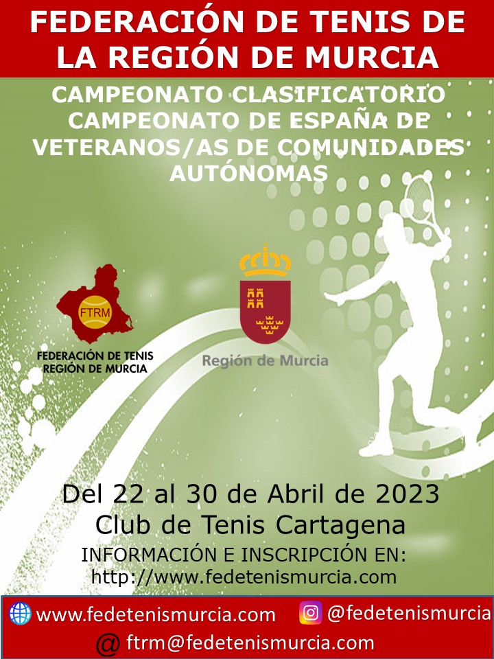 La Federación de Tenis de la Región de Murcia, abre el plazo de inscripción del Campeonato de Veteranos/as Individual en las categorías +45, +55 y +65, clasificatorio para el Campeonato de España de Comunidades Autónomas de Veteranos/as.