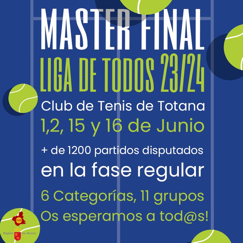 Por otro lado, anunciar que el master final de la Liga de Todos 23/24 será en el CLUB DE TENIS TOTANA los días 1,2,15 y 16 de junio.