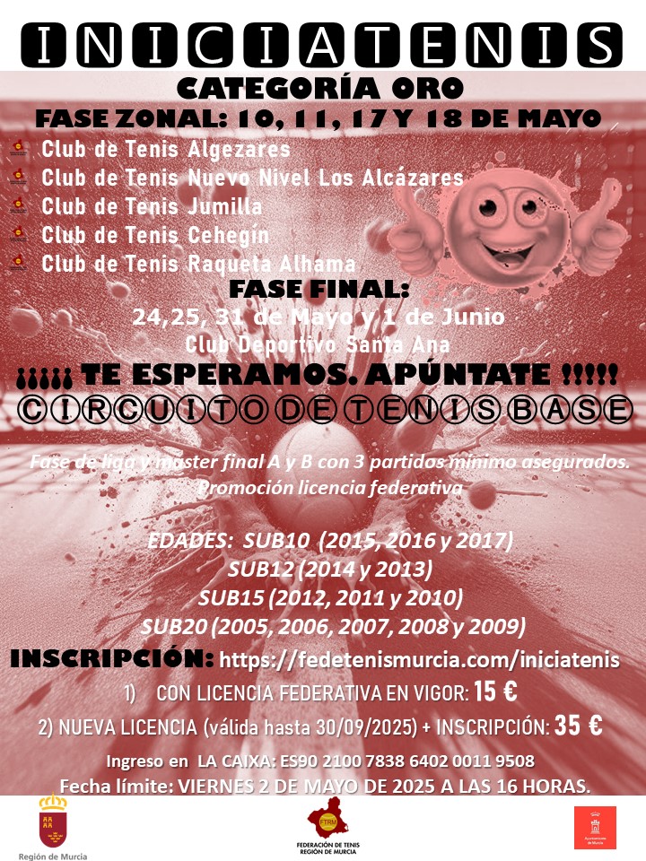 A partir del 10 de Mayo, las sedes del Club de Tenis Algezares, Club de Tenis Cehegín, Club de Tenis Raqueta Alhama, Club de Tenis Nuevo Nivel Los Alcázares y Club de Tenis Jumillas, albergarán una nueva entrega del Iniciatenis, cuya fase final se disputará en el Club Deportivo Santa Ana de Cartagena.