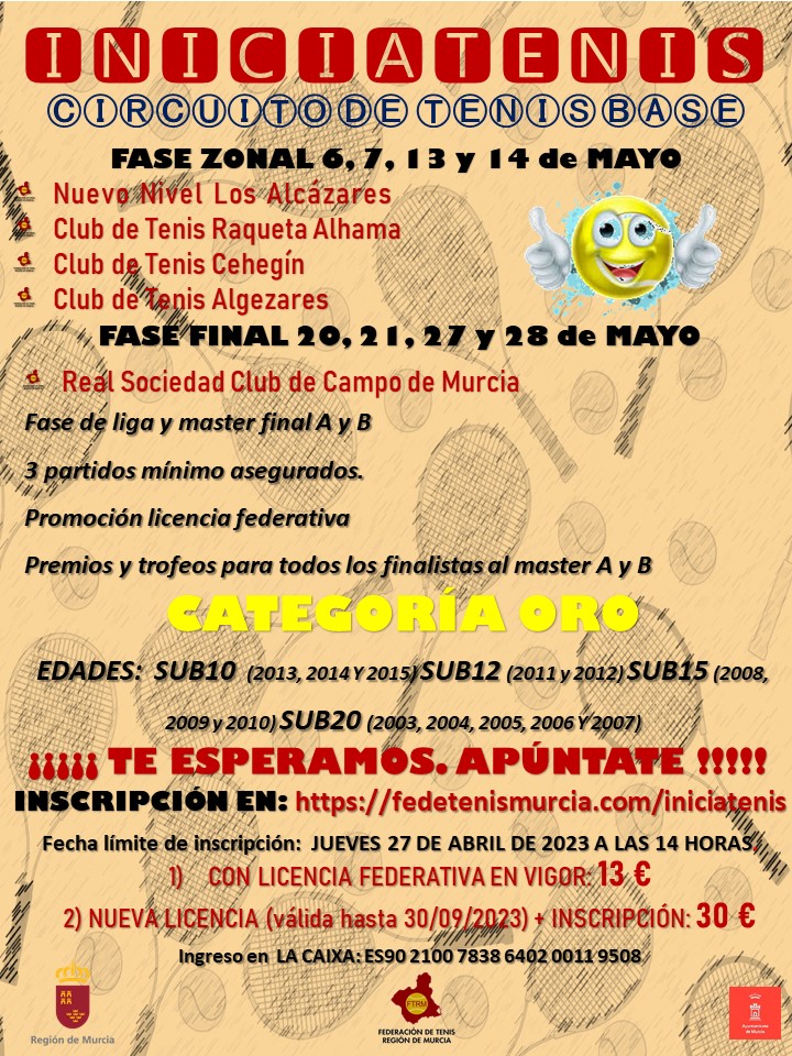 La Federación pone en marcha un nuevo Iniciatenis que comenzará a partir del próximo 6 de Mayo. Las fases zonales y de liga se disputarán en los siguientes clubes: Club de Tenis Cehegín, Club de Tenis Raqueta Alhama, Nuevo Nivel Los Alcázares y Club de Tenis Algezares. La fase final se disputará en la Real Sociedad Club de Campo de Murcia.