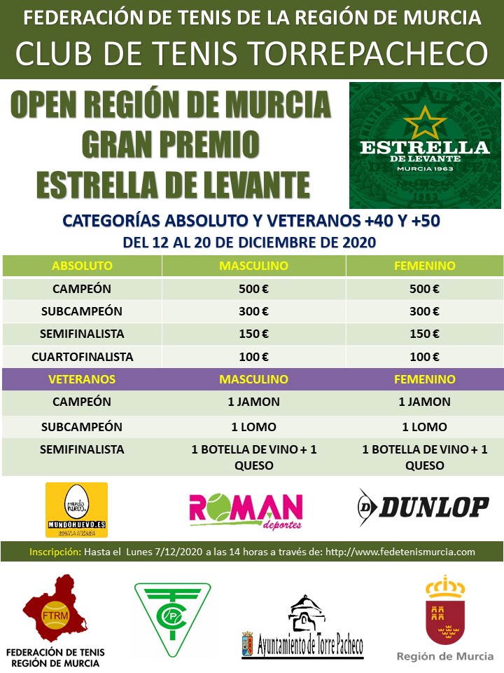 En el Club de Tenis Torrepacheco, se va a disputar el Open Región de Murcia “Gran Premio Estrella de Levante” en las categorías absoluto, veteranos +40 y veteranos +50 tanto masculino como femenino.